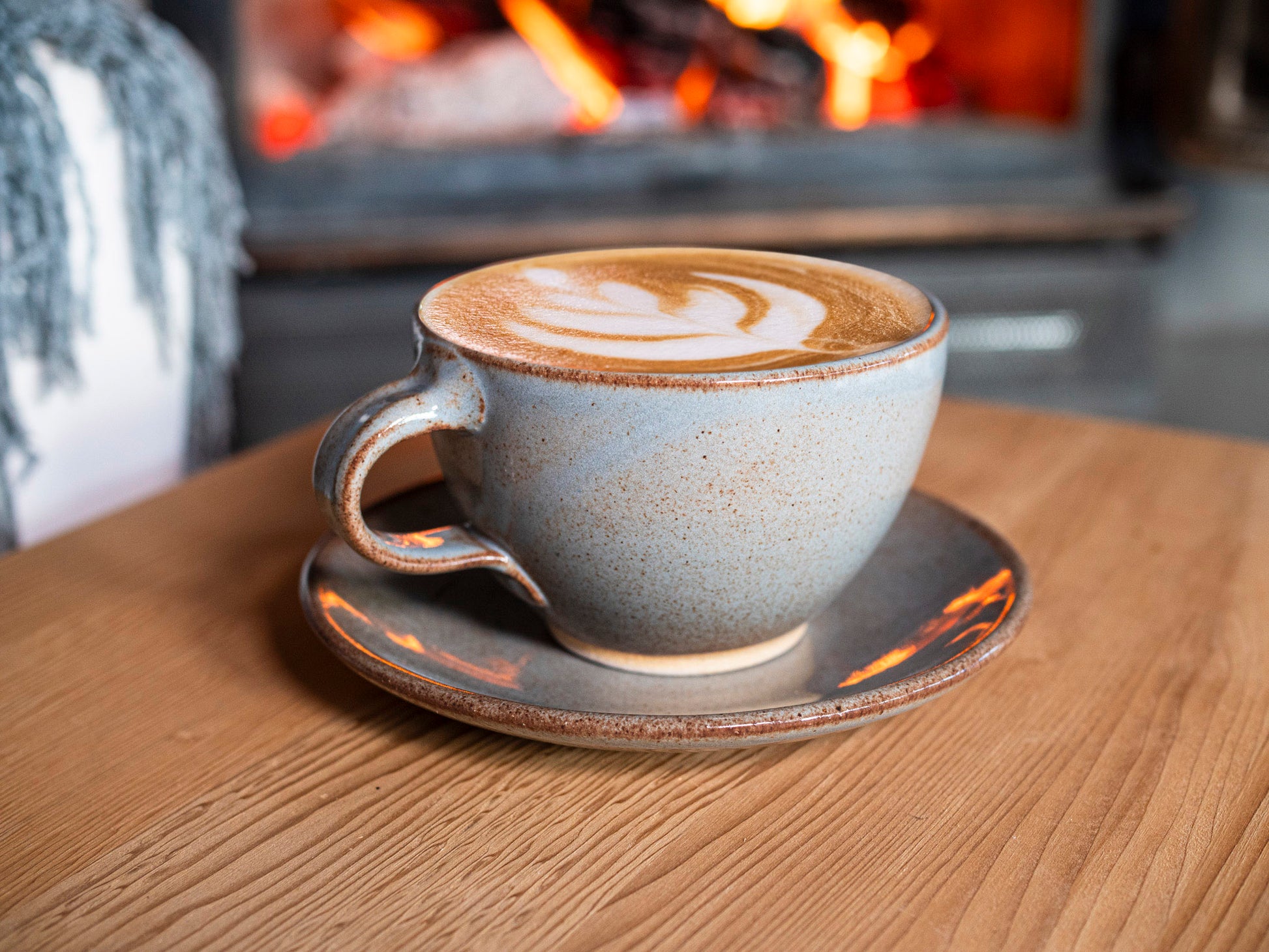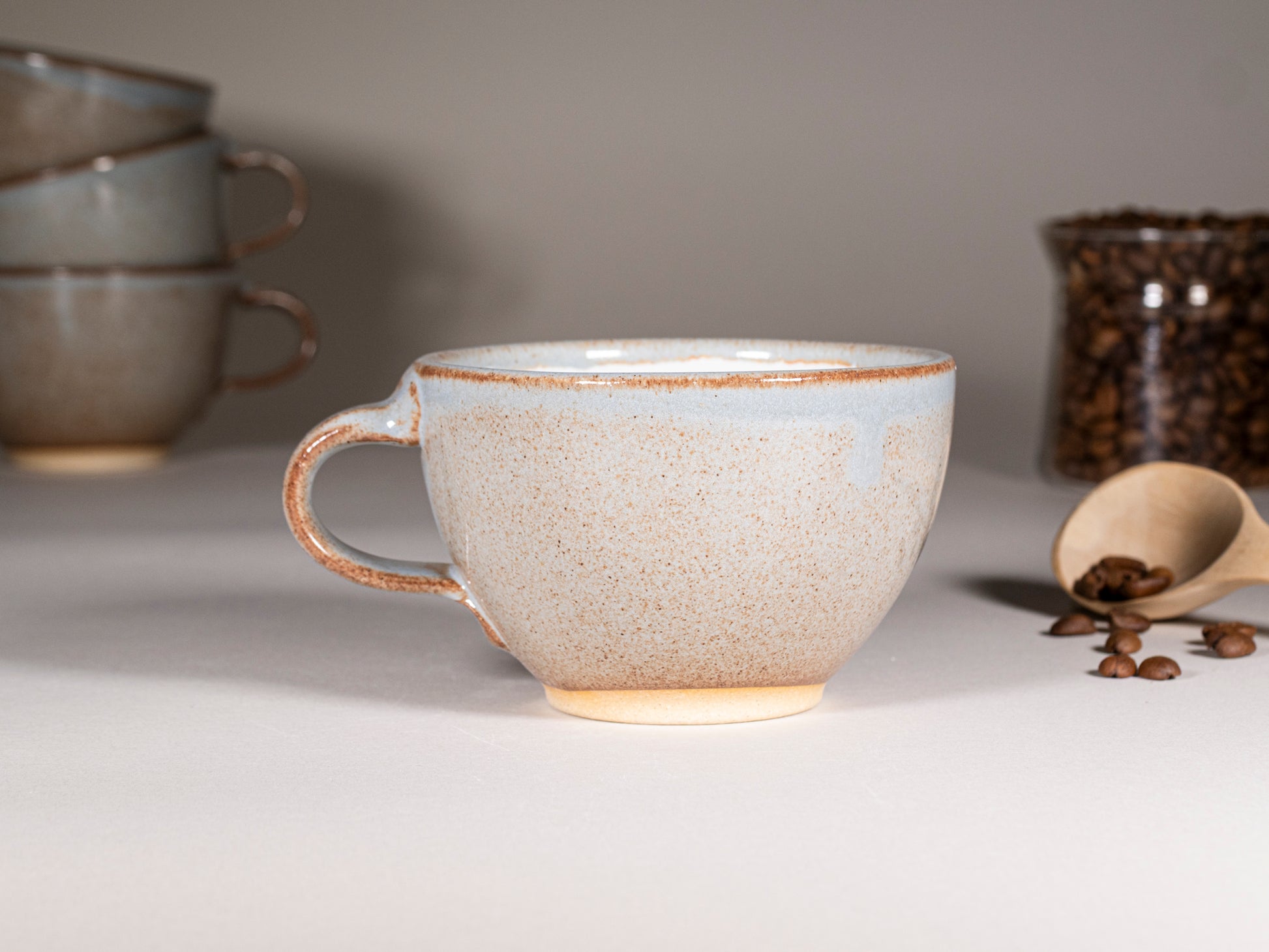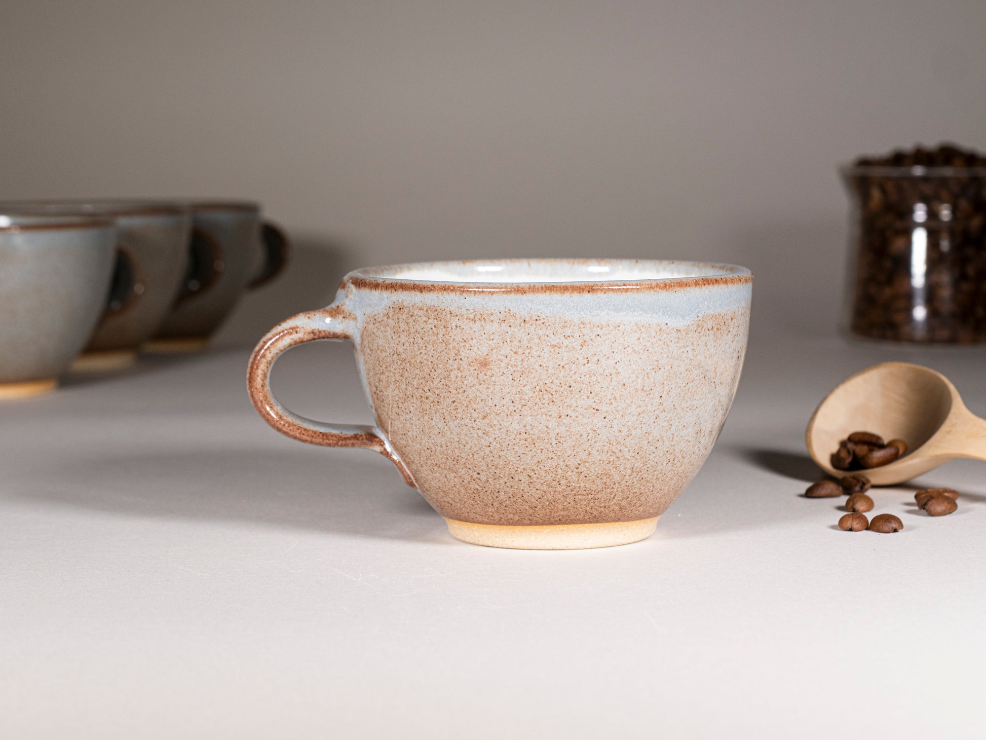 Modern latte/cappuccino cup in brown-blue white and 10β12 oz capacity can be paired with our medium size saucer. It is ideal for home brewing and makes a great gift for a barista. This unique ceramic set adds charm to any coffee bar and is a practical gift for daily life.
