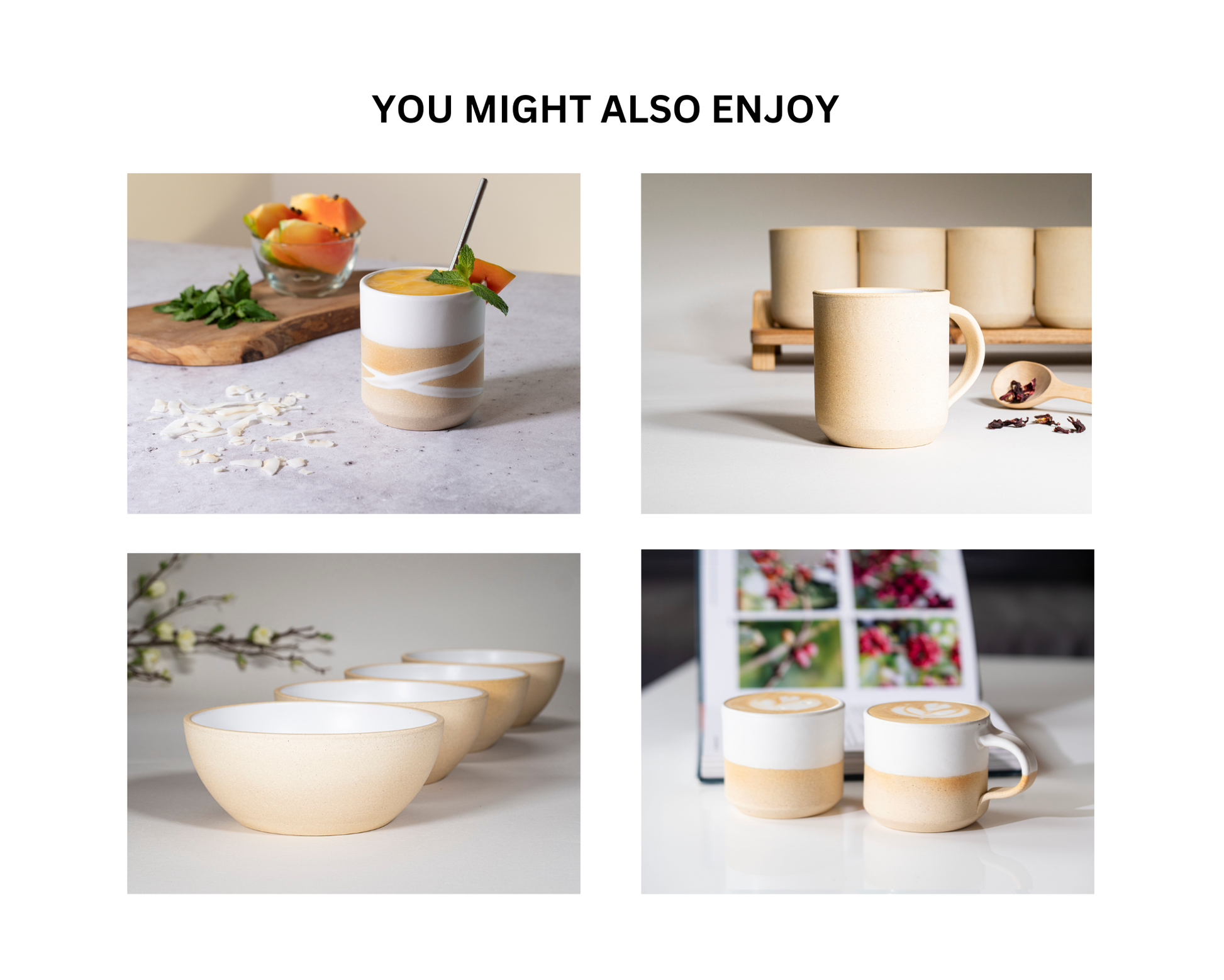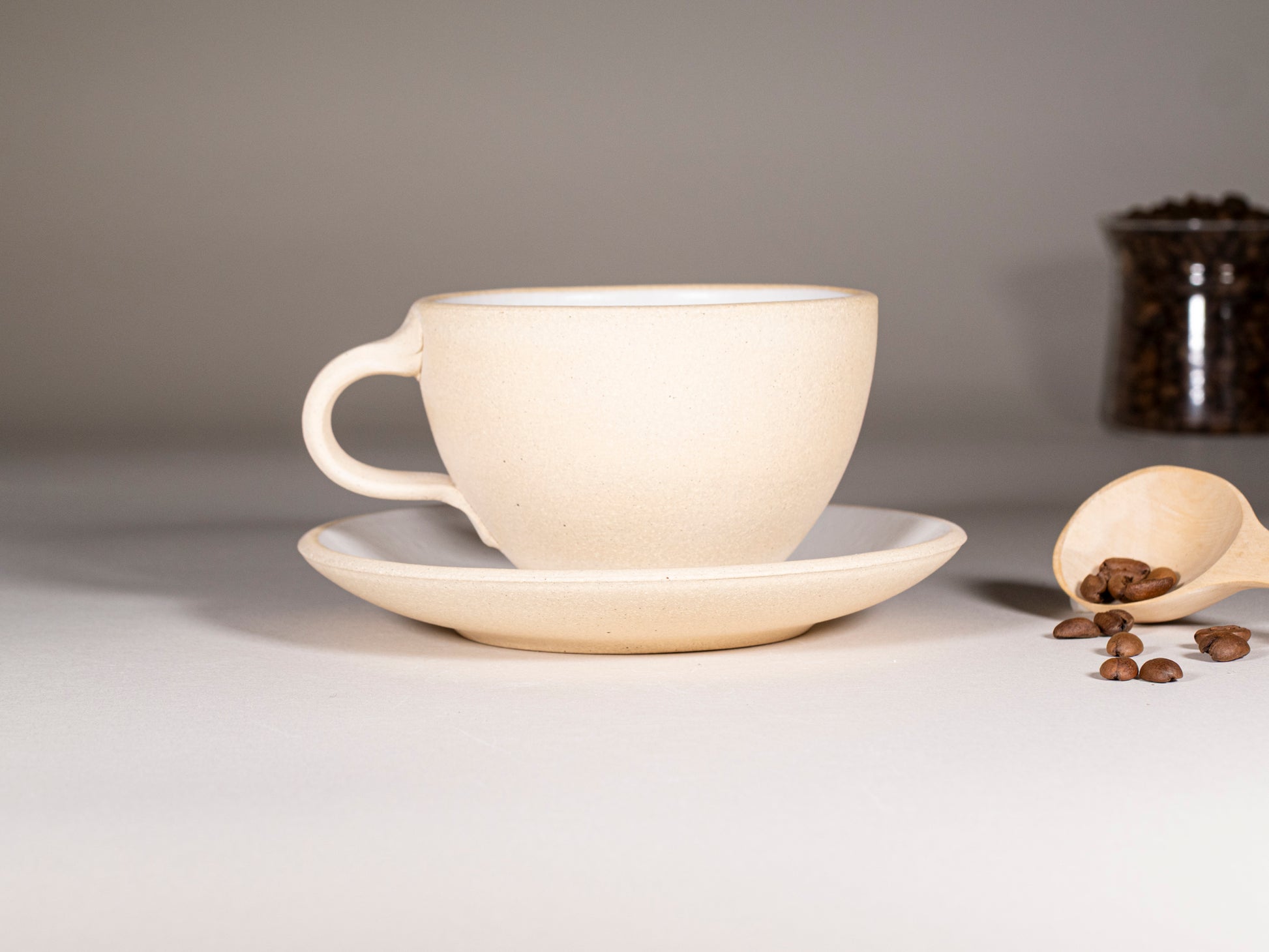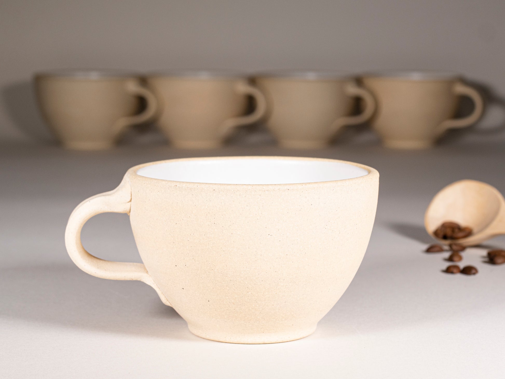 Modern latte/cappuccino cup in sandy white and 10β12 oz capacity can be paired with our medium size saucer. It is ideal for home brewing and makes a great gift for a barista. This unique ceramic set adds charm to any coffee bar and is a practical gift for daily life.