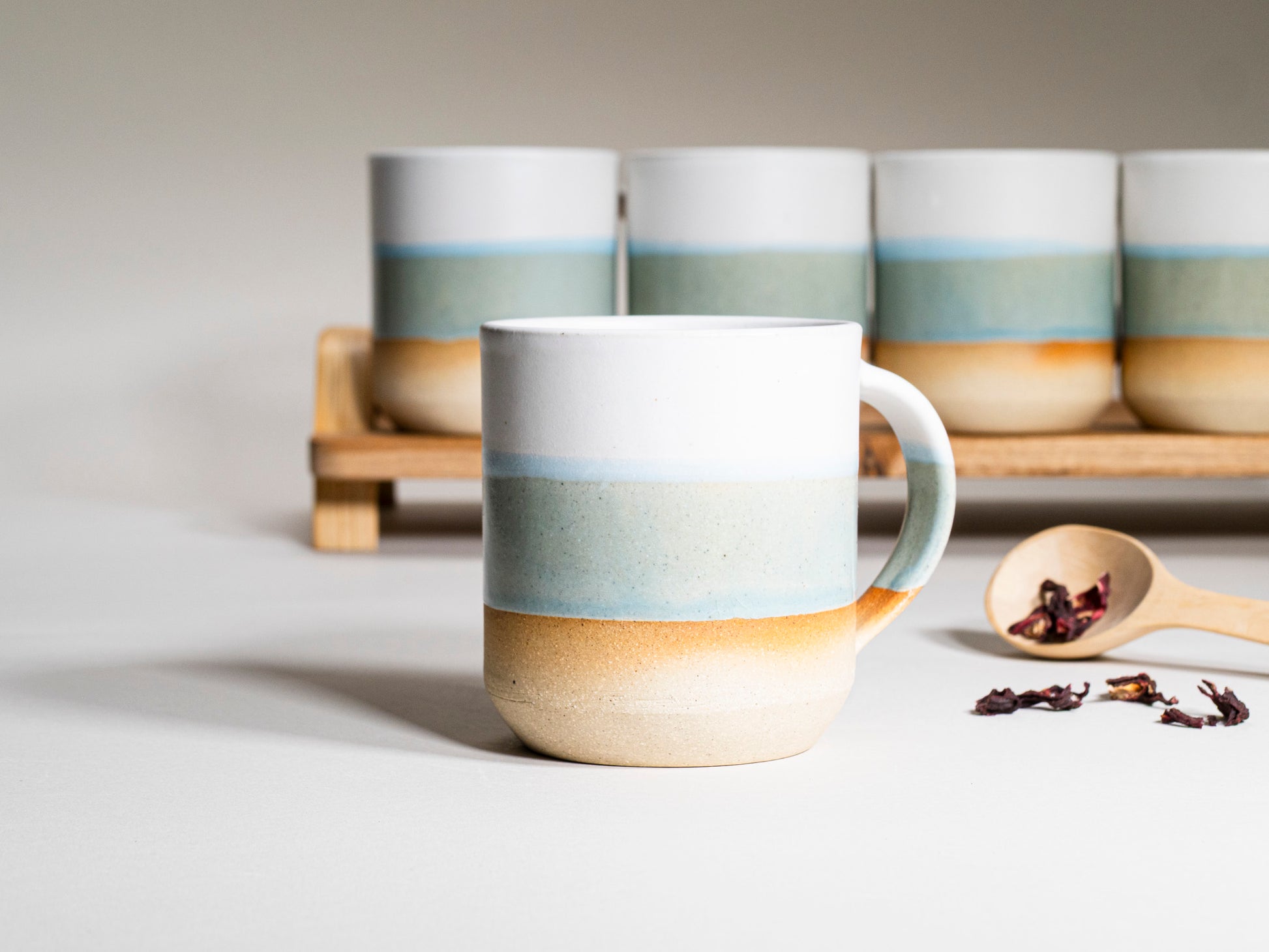 Unique mug in blue grey, and white 14 oz tumbler is ideal for a health enthusiast gift. This stoneware drinkware also makes a stylish addition to summer party settings or a thoughtful housewarming gift.