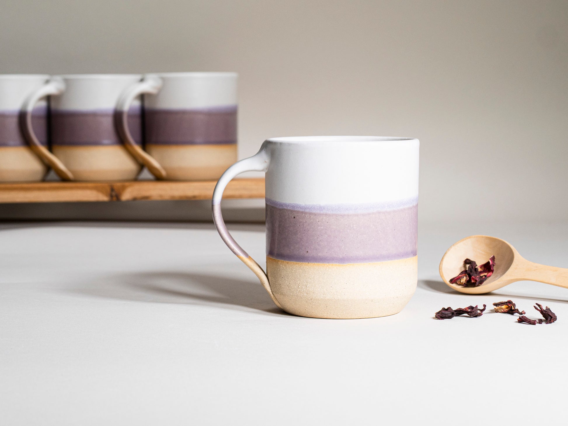 Aesthetic coffee or tea 14 oz mug in purple and white is ideal for a wellness lover or fitness instructor gift. This stoneware tableware supports a healthy lifestyle with both style and function.