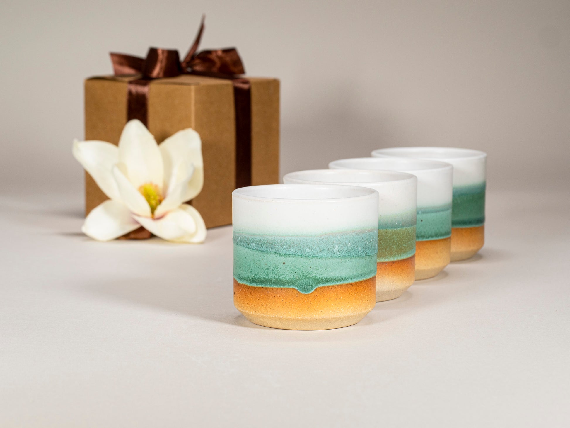 This set includes one modern ceramic green and white 14 oz tumbler with a matching 5.5 oz cup carefully packaged in a craft gift box with a bow.