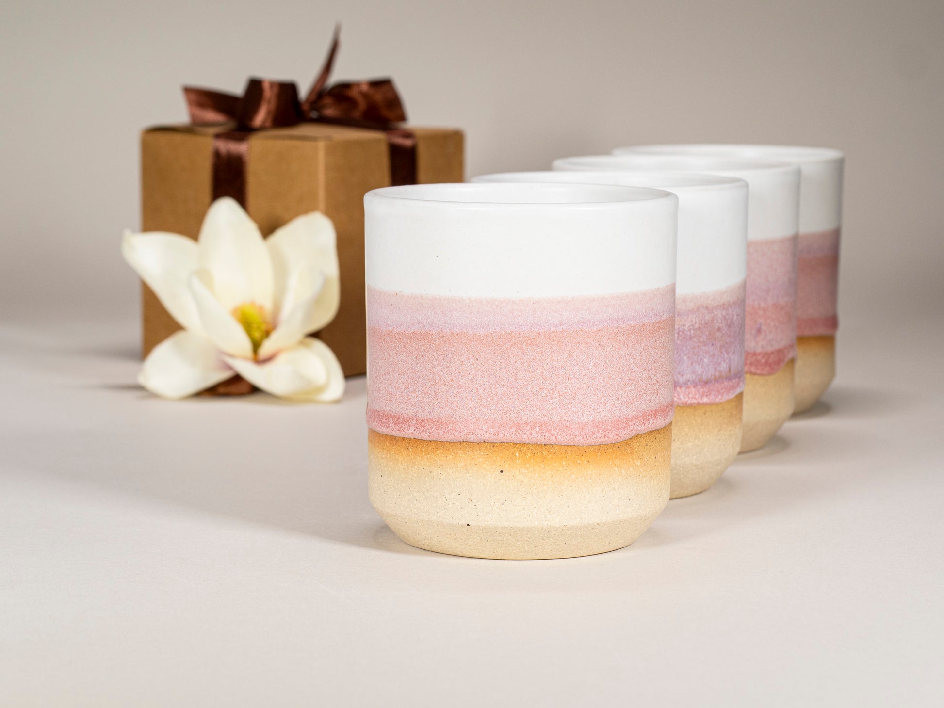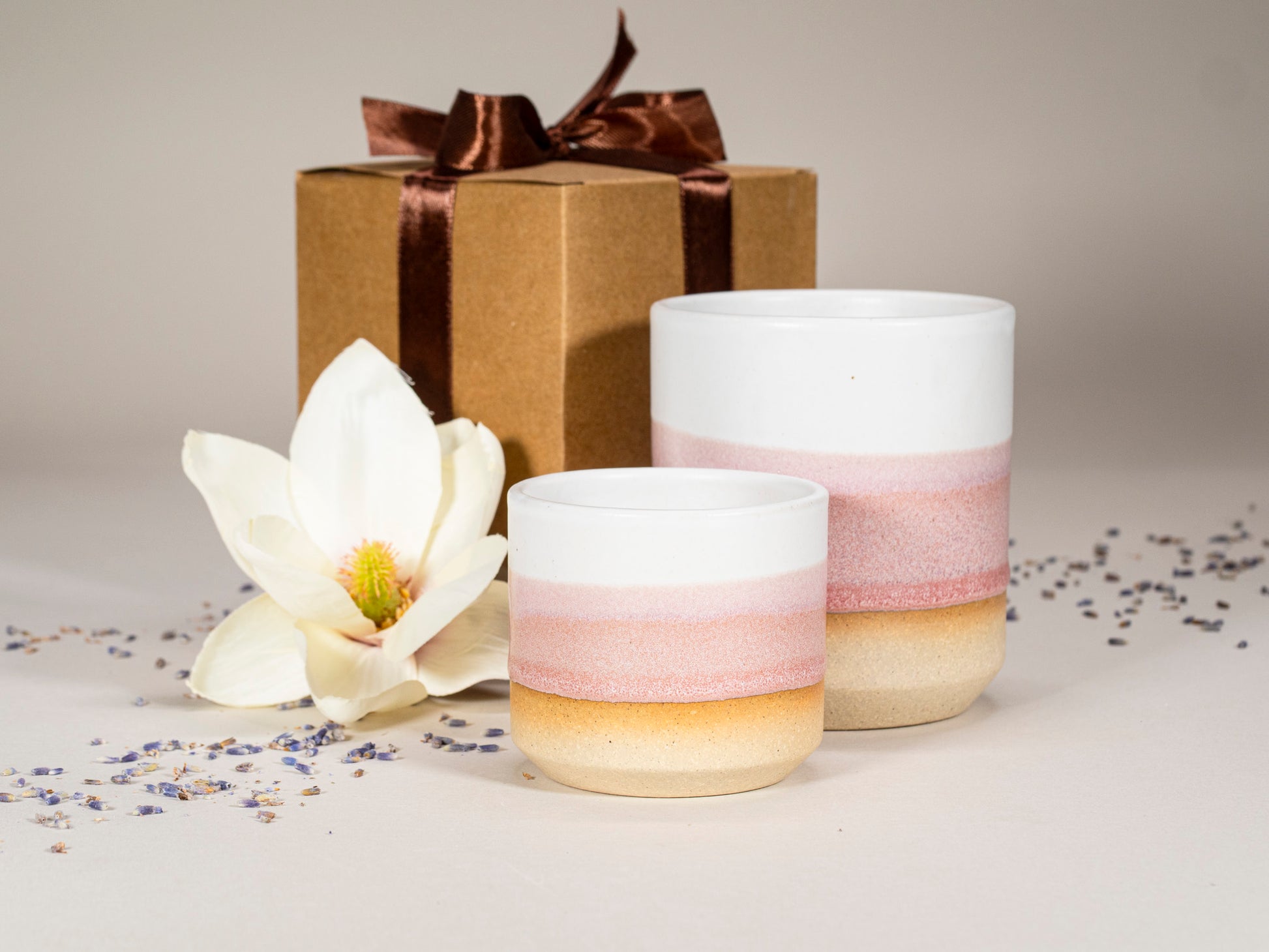 This set includes one modern ceramic pink white 14 oz tumbler with a matching 5.5 oz cup carefully packaged in a craft gift box with a bow.