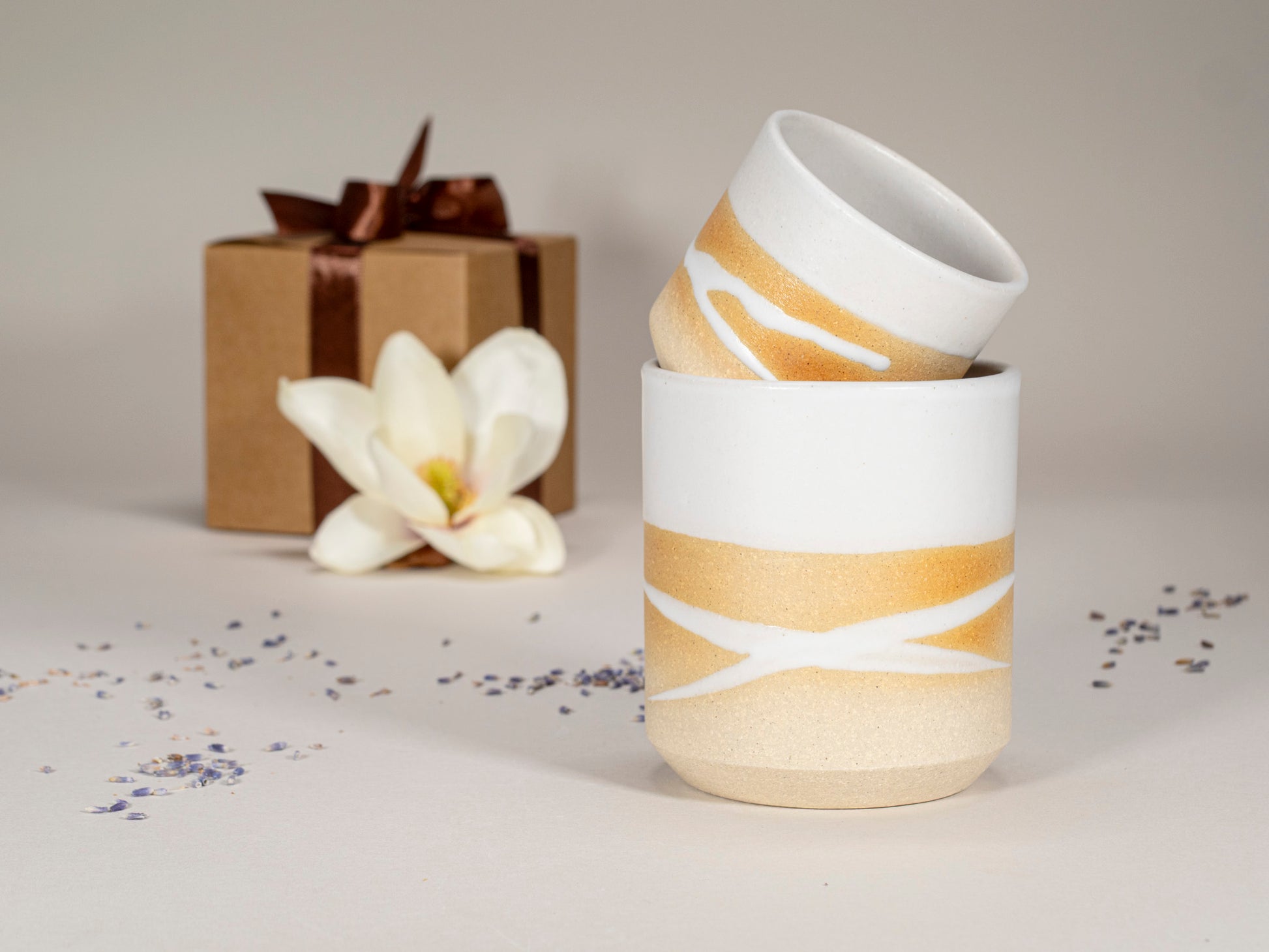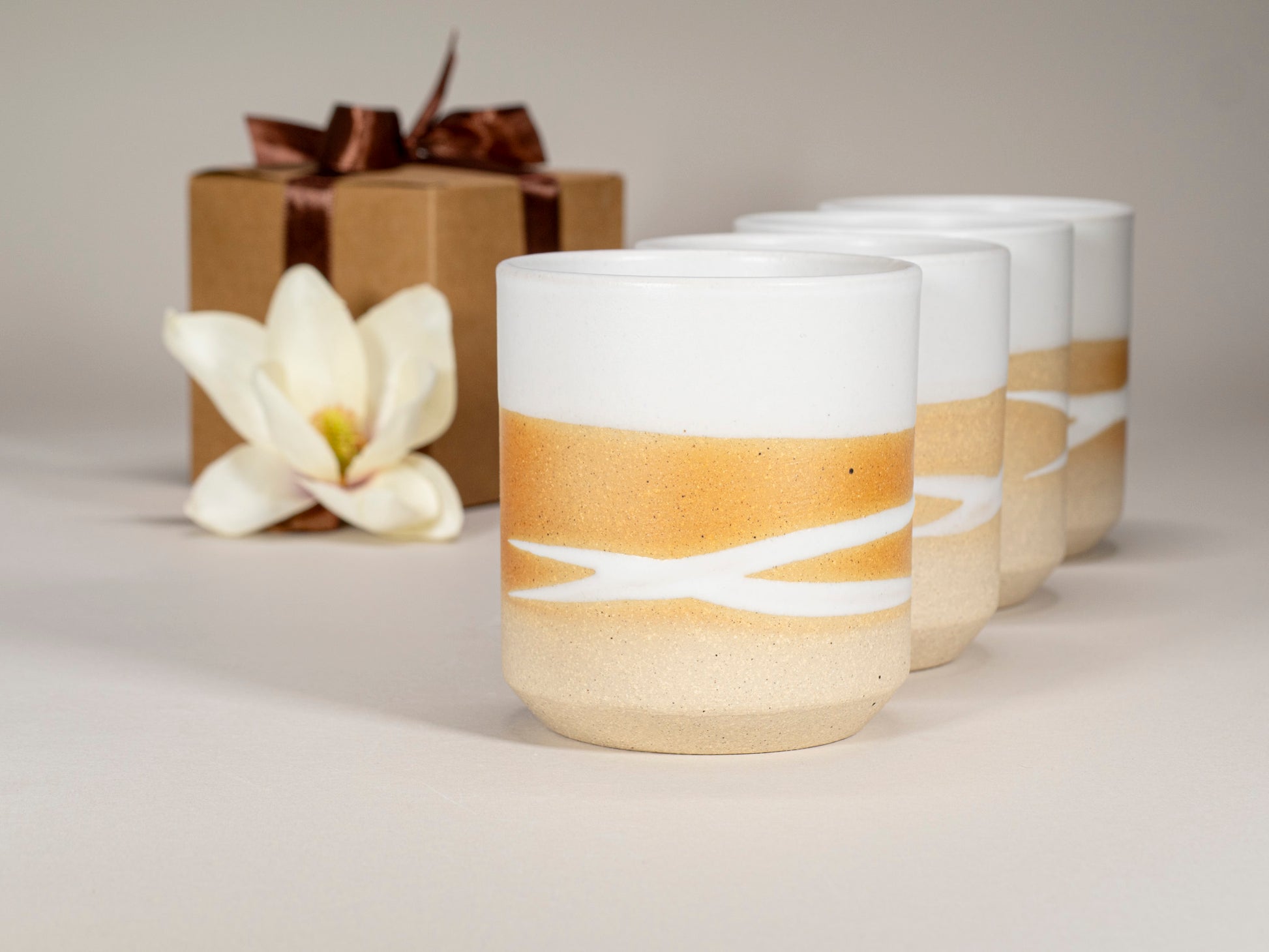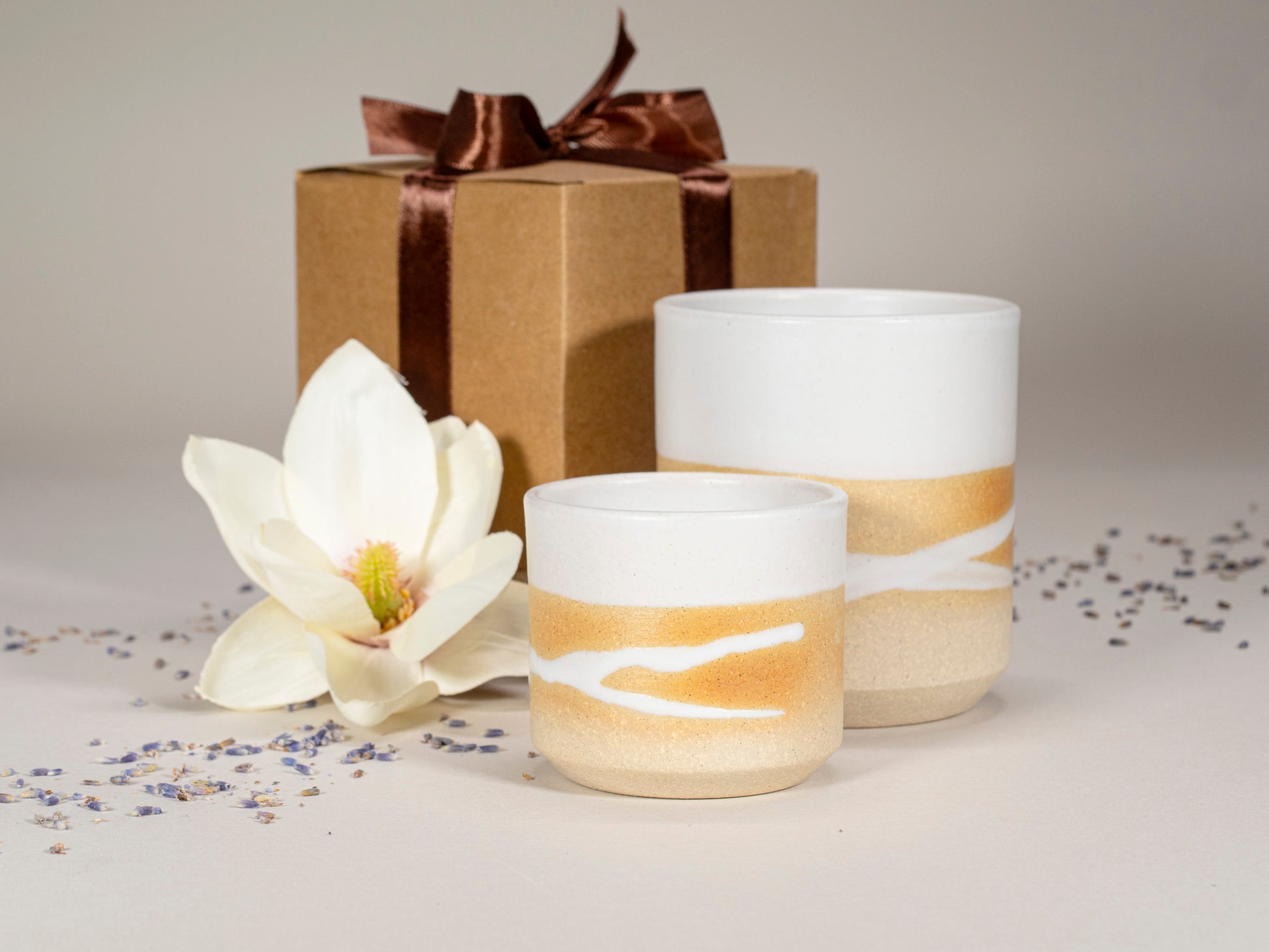 This set includes one modern ceramic sandy white with trailing 14 oz tumbler with a matching 5.5 oz cup carefully packaged in a craft gift box with a bow.